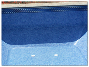 Step 6.Installation of vinyl liner and coping. The liner snaps into a special track along the coping and then a vacuum sucks out excess air between the pool wall and liner, ensuring a snug fit.