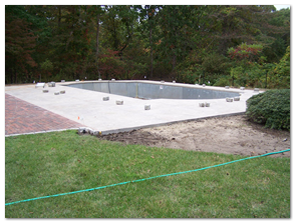 Step 7.Pouring of the concrete deck. The options here are endless: pavers, stamped concrete, brick and more. Beneath the surface, the Fort Wayne Pools bracing system works to support the decking and keep it from shifting or cracking.